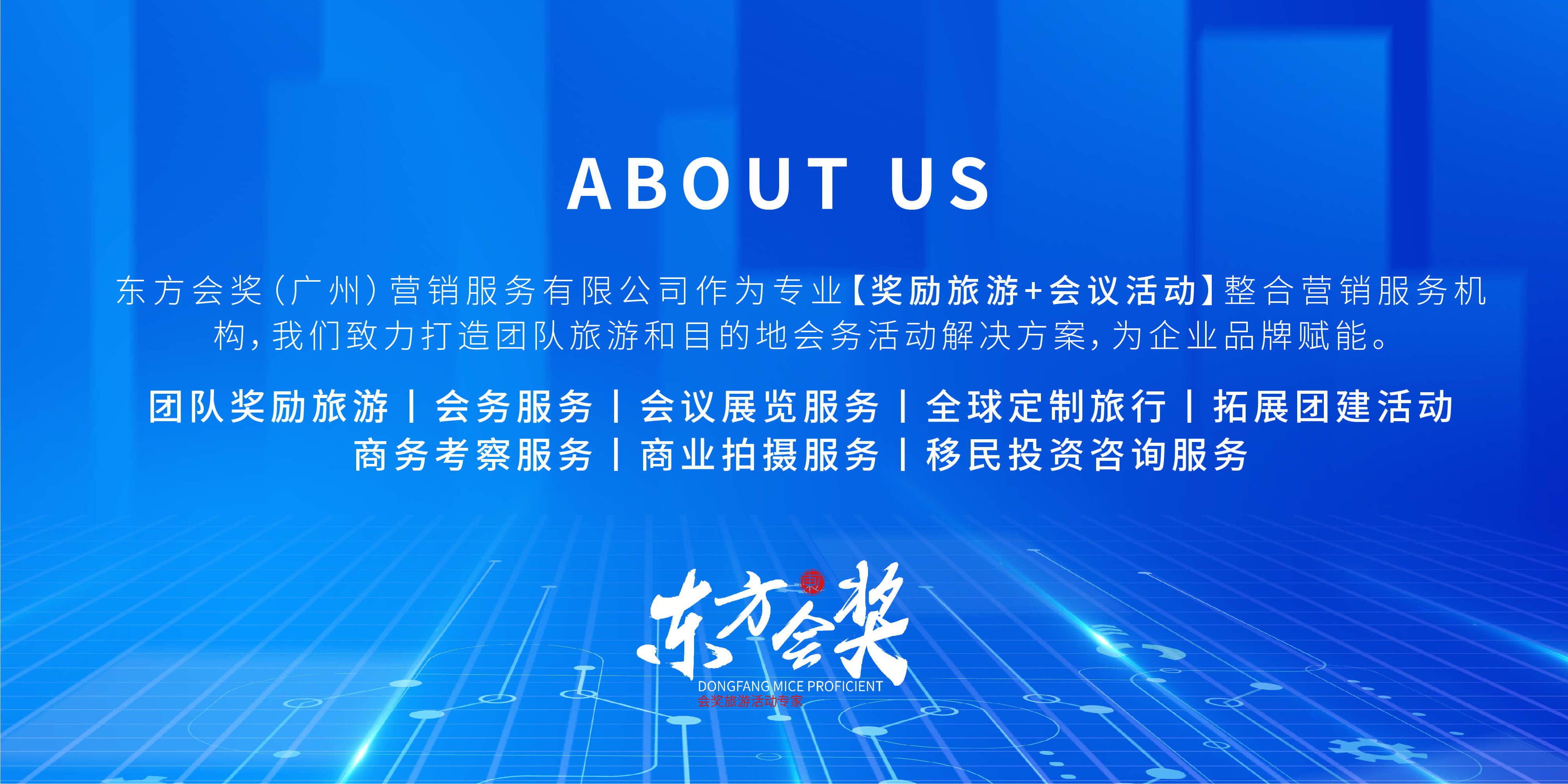 東方會(huì)獎(jiǎng)(廣州)營銷服務(wù)有限公司 作為專業(yè)會(huì)獎(jiǎng)旅游活動(dòng)專家,我們致力打造專業(yè)團(tuán)隊(duì)旅游和目的地會(huì)務(wù)會(huì)展解決方案,為企業(yè)品牌賦能。 基于對(duì)商業(yè)客戶需求的深刻理解和豐富的服務(wù)經(jīng)驗(yàn),東方會(huì)獎(jiǎng)成功實(shí)現(xiàn)從單一服務(wù)到整合服務(wù)、從簡單服務(wù)到高附加值服務(wù)、從線下服務(wù)到覆蓋線上線下的整合營銷服務(wù)布局,旗下東方會(huì)獎(jiǎng)、途蘭朵旅行、左契文化、途蘭朵科技、全球開拓者等各業(yè)態(tài)的專業(yè)子公司相繼成立。目前,東方會(huì)獎(jiǎng)已經(jīng)在中國主要經(jīng)濟(jì)區(qū)域建立了完善的服務(wù)網(wǎng)絡(luò),覆蓋廣州、深圳、佛山、杭州、成都、貴陽、西安、福州、廈門、桂林、長沙等核心城市。 成立至今,東方會(huì)獎(jiǎng)一直專注于為新零售、保險(xiǎn)、金融、直銷等機(jī)構(gòu)客戶提供“一站式”整合營銷服務(wù),業(yè)務(wù)涵蓋:團(tuán)隊(duì)獎(jiǎng)勵(lì)旅游,目的地會(huì)務(wù)服務(wù),會(huì)議展覽服務(wù),全球定制旅行,拓展團(tuán)建活動(dòng),商務(wù)考察服務(wù),專業(yè)旅行拍攝服務(wù)。為企業(yè)品牌實(shí)現(xiàn)真正的全案整合營銷。